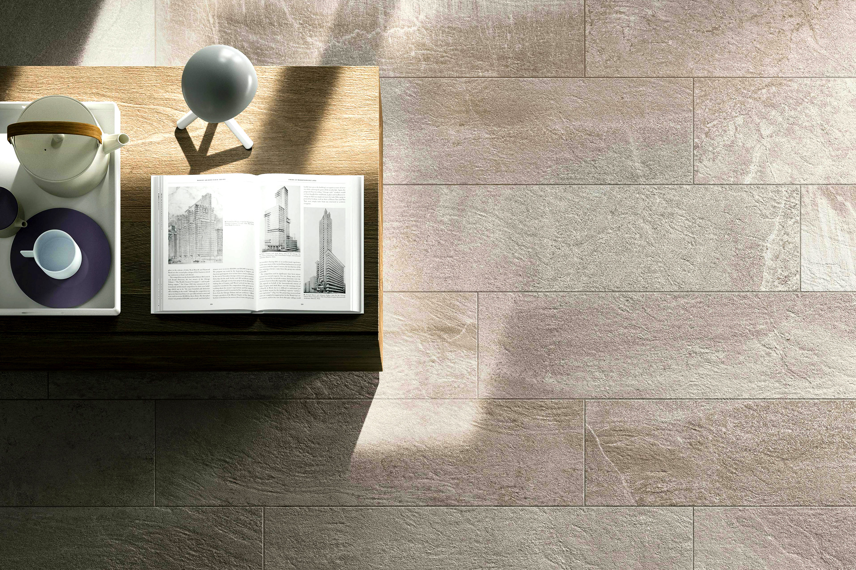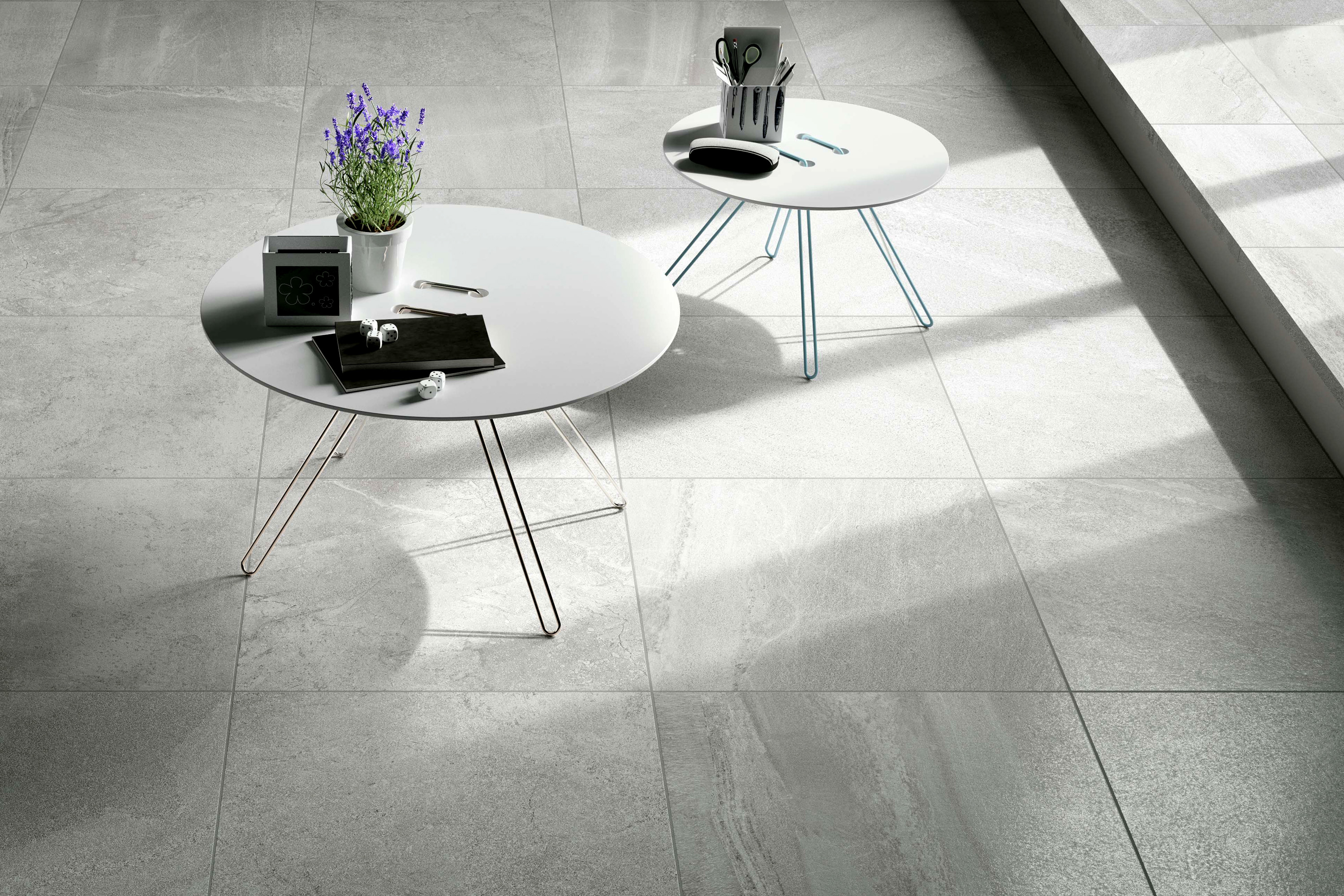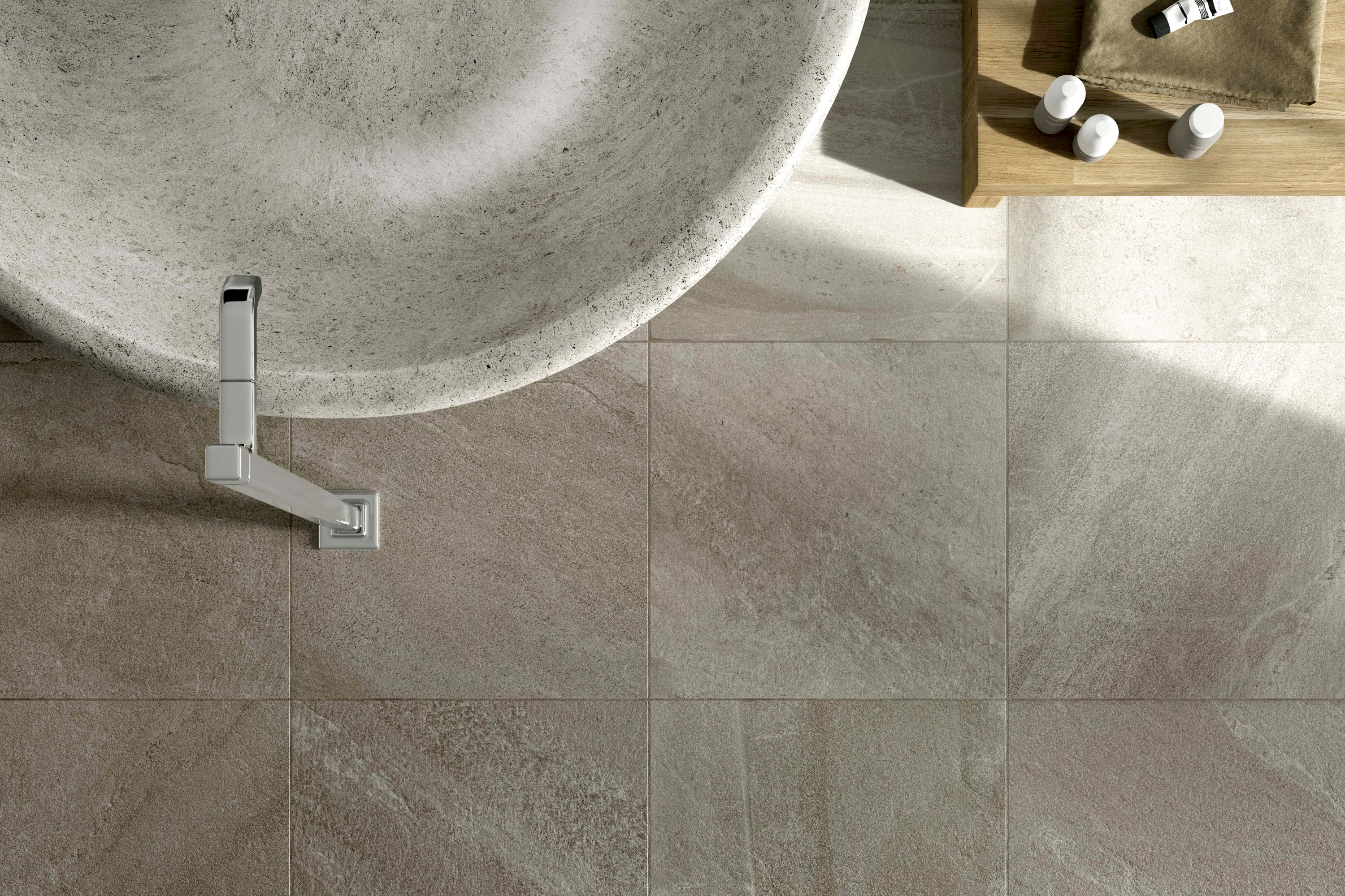 Forward coloured body fine porcelain tiles (ISO 13006:2012 Annex G, group Bla) are produced by dry pressing high‐quality spray‐dried clays of various colours. Forward marks the culmination of a creative process that began by observing various types of stone, in particular quartzite and multicoloured slate, then combined multiple photos to capture and re‐ elaborate their essence. The result is a harmonious visual and colour experience in which the stratifications of certain types of stone are enhanced by crystalline effects typical of other minerals.