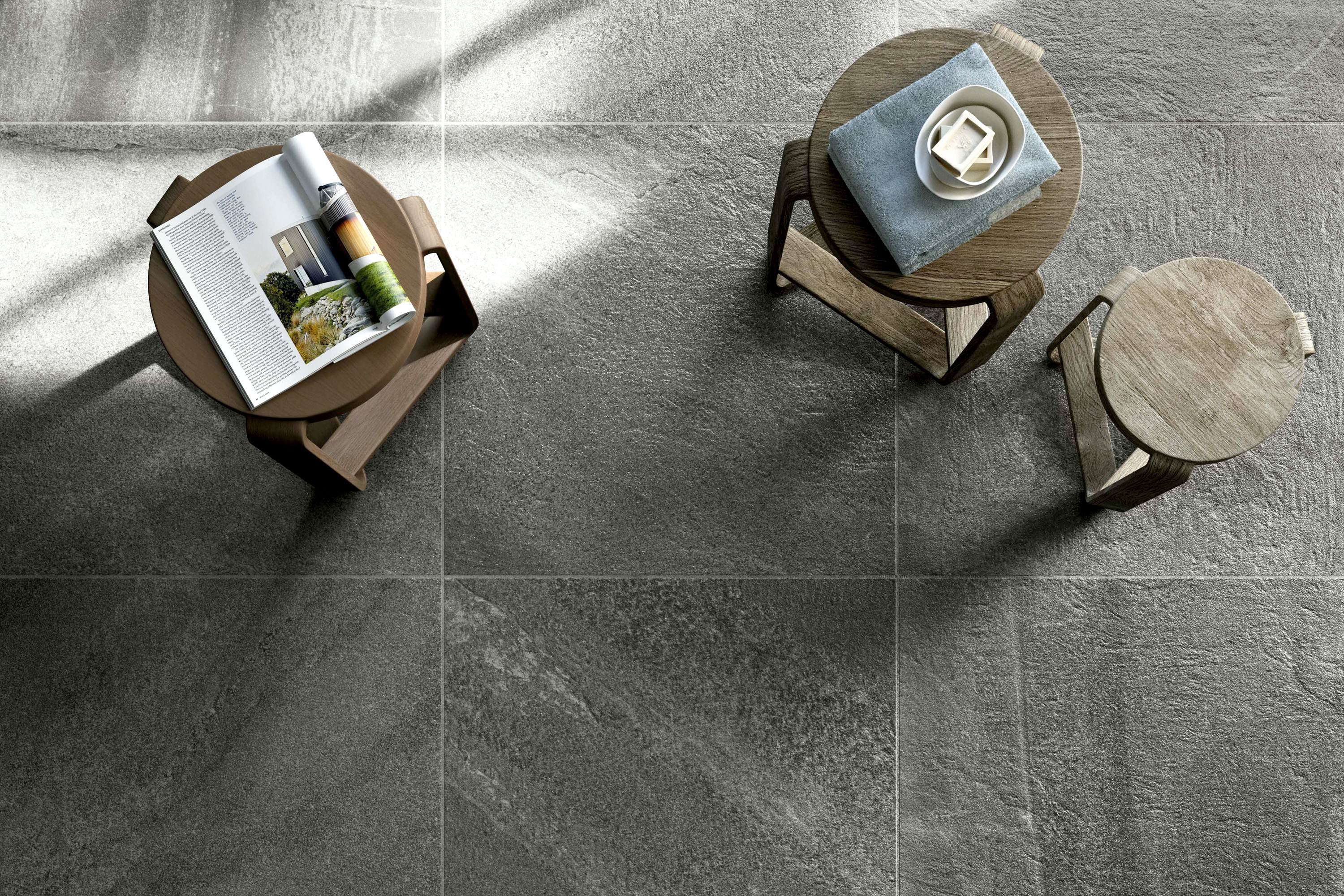 – Available in a wide range of sizes and 4 different colours (Sand, Earth, Grey, Black), Forward can be used with enormous creative freedom in many different settings, including modern residential and commercial spaces as well as bathroom and wellness areas. For outdoor use, Forward comes in 20 x 20cm and 20 x 40cm sizes for conventional installation and a brand‐new 40 x 80cm size with extra‐large 20mm thickness suitable for use on raised floors and for dry installation on gravel, grass and sand.