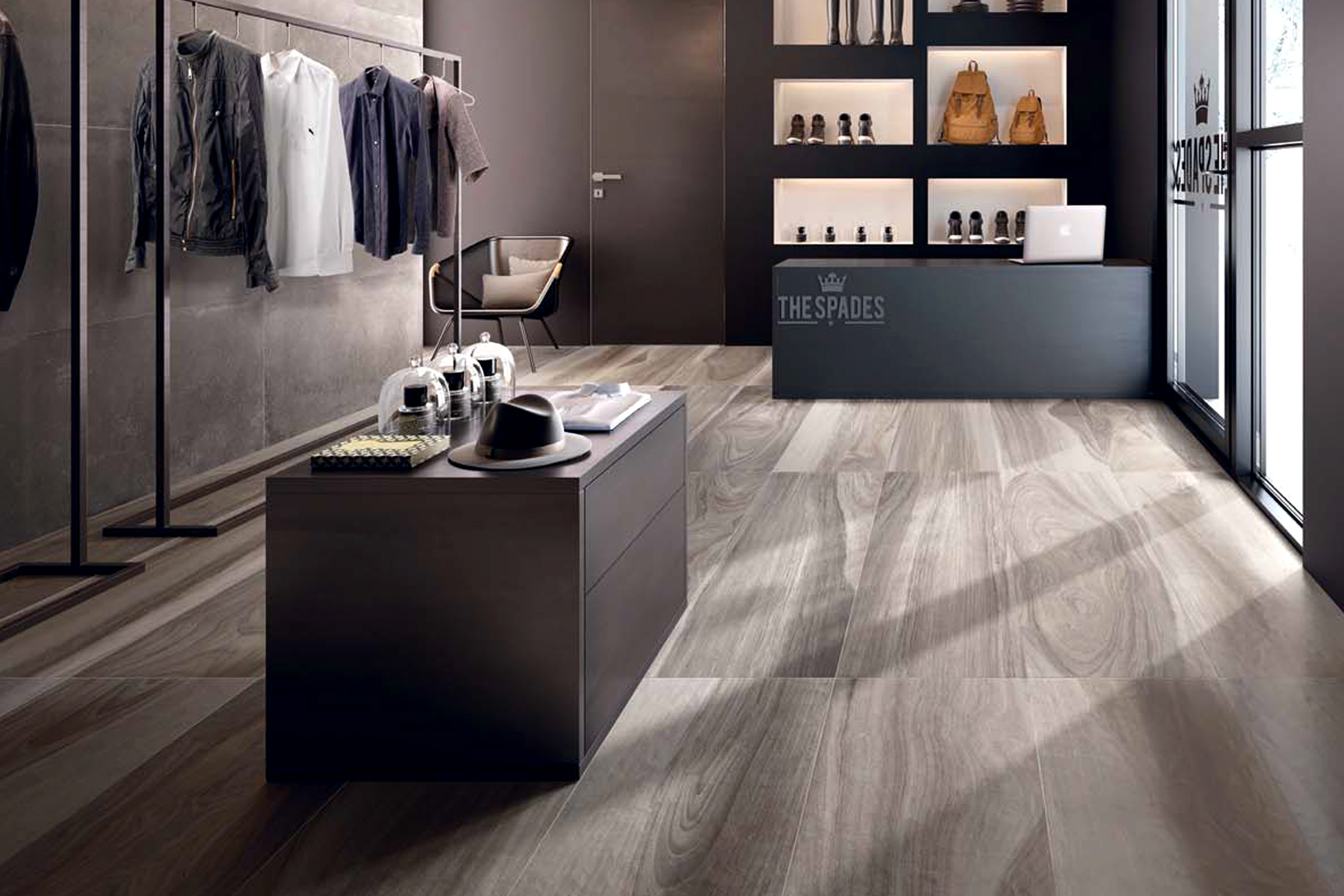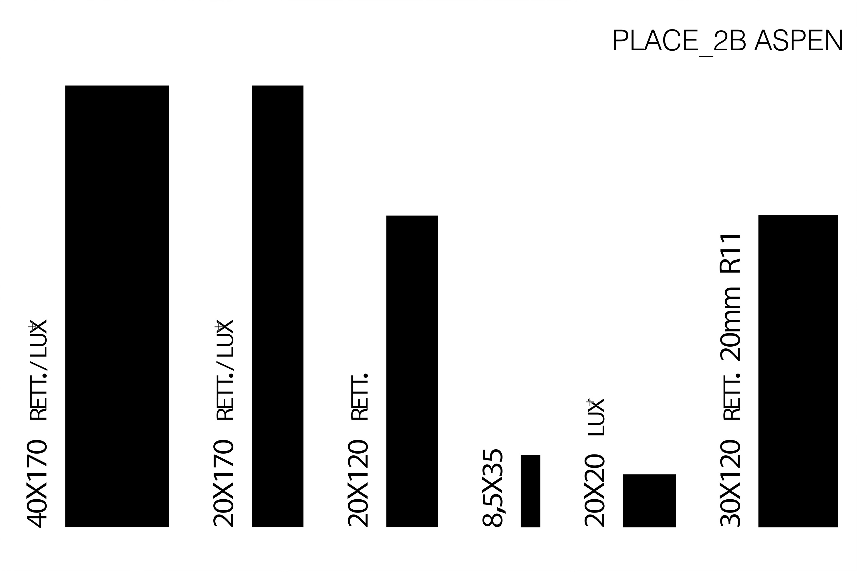 – Place_2B Aspen is available in three colours (Natural, Havana, Grey), 40 x 170cm, 20 x 170cm and 20 x 120cm sizes with a natural surface, a 30 x 120cm size (thickness 20mm) R11 for exteriors, and 40 x 170cm and 20 x 170cm sizes with a Lux+ surface. Lux+ technology makes the honed surfaces surprisingly glossy, but at the same time extremely hard wearing and easy to clean. PLACE_2B Aspen is produced using exclusive Auto‐leveling technology to ensure perfectly flat floors in any situation. The tiles can be installed using either conventional techniques or the INSTA‐TILE system, which avoids the need for grout or adhesive and has the advantage of rapid removal and complete reusability.